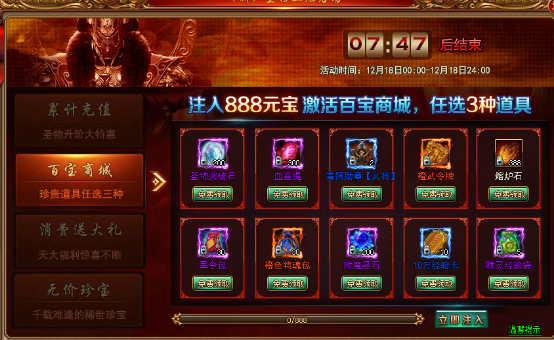 活动期间玩家只要在百宝商城中注入“888元宝”即可在在百宝商城中任选3件道具!每种道具只能领取一次,特大优惠,请慎重选择!