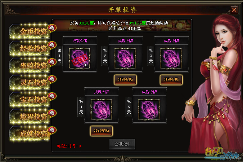 活动时间:开服前三天可进行投资,投资奖励后续5天领取完毕