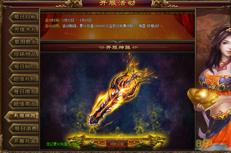 活动时间:开服前5天 活动内容:活动期间,累计充值1000000元宝即可免费领取1个神器-轩辕剑!