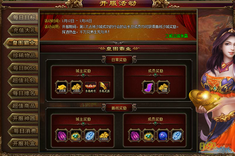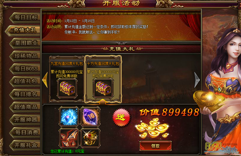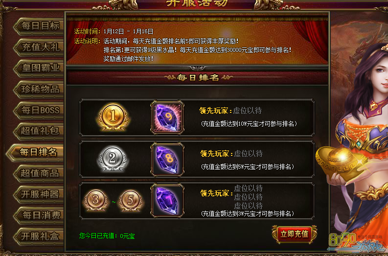 活动时间:开服前5天 活动内容:每日消费金额达到一定条件时,即可领取丰厚的奖励!