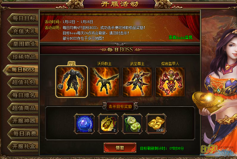 活动时间:开服前5天 活动内容:每日均有4只目标BOSS,成功击杀便可领取极品奖励!目标boss每日24点将会刷新,请及时击杀!部分boss存在于多个地图!