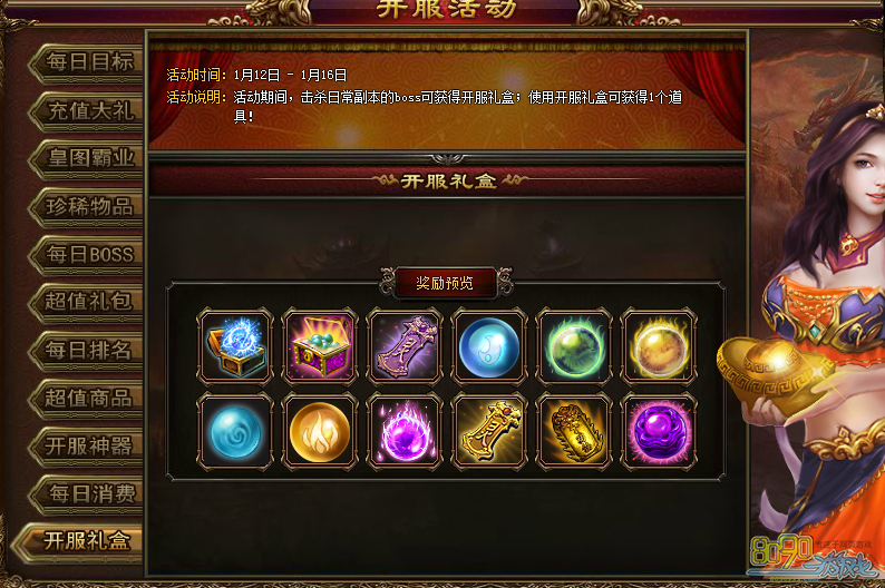 活动时间:开服前5天 活动内容:活动期间,击杀日常副本的boss可获得开服礼盒!使用开服礼盒可获得1个道具!