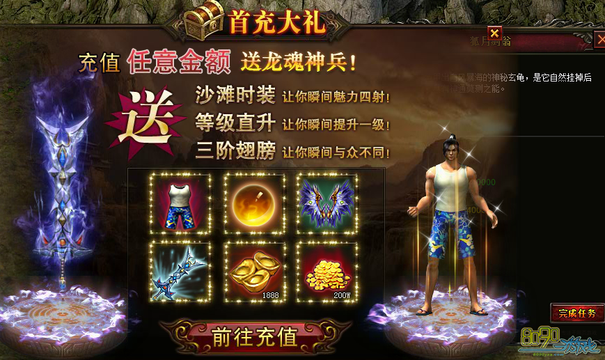 奖励内容:等级直升丹(70级之前可升一级)、沙滩时装*1、屠兽羽翼(3档)、龙魂震天斩、1888绑定元宝、200万绑定金币。