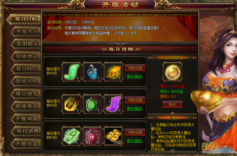 活动时间:开服前5天 活动内容:开服5日活动期间,每日完成对应的目标,即可获取超值奖励!每天更有限量版助力商品出售,让你快人一步!