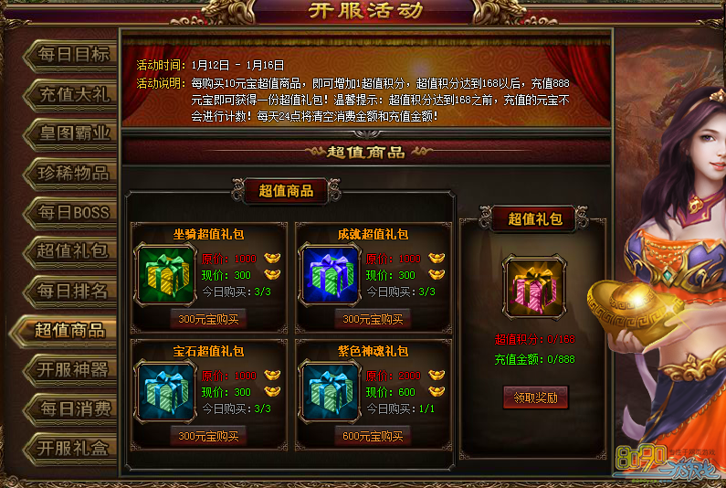 活动时间:开服前5天 活动内容:每购买10元宝超值商品,即可增加1超值积分,超值积分达到168以后,充值888元宝即可获得一份超值礼包!温馨提示:超值积分达到168之前,充值的元宝不会进行计数!每天24点将清空消费金额和充值金额。