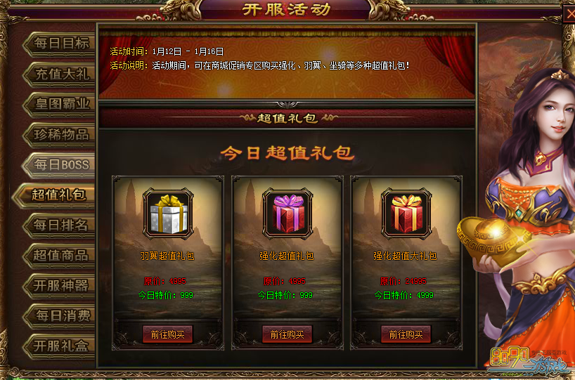活动时间:开服前5天 活动内容:活动期间,可在商城促销专区购买强化、羽翼、坐骑等多种礼包!