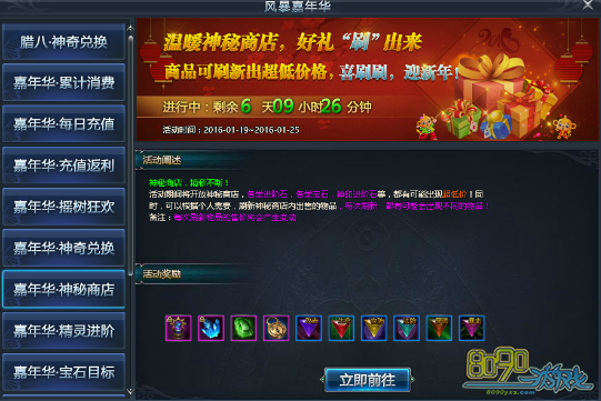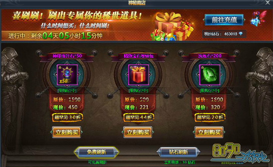 活动期间将开放神秘商店,各类进阶石,各类宝石,神印进阶石等,都有可能出现超低价,各种超低折扣不容错过!同时,可以根据个人需要,刷新神秘商店内出售的物品,每次刷新,都有可能会出现不同的物品!