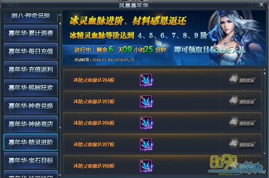 【活动内容】:冰精灵血脉进阶、材料感恩返还!活动期间,冰精灵血脉等级提升至指定等阶,即可获得巨额精灵进阶石返还!