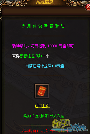 【活动内容】活动期间,每日累计充值10000元宝即可获得新春红包1个(注:限1个)