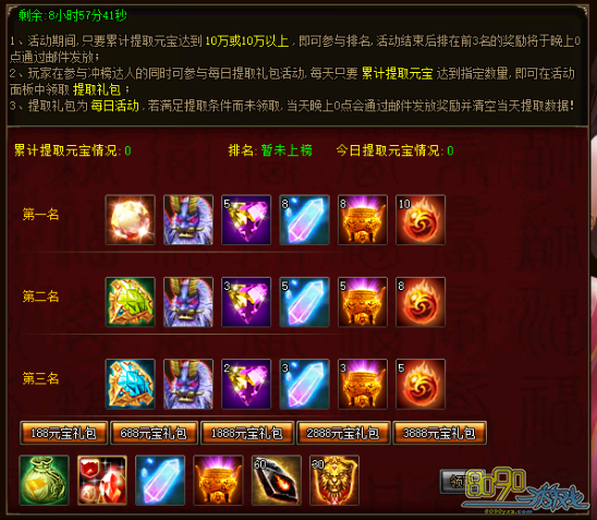 a) 活动期间,累计提取元宝10W以上且排行前3的玩家可获得排行奖励,奖励于活动结束时以邮件发送。