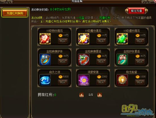 活动详情:活动期间,玩家每充值一元宝可获得一个充值红利,红利可用于购买活动中的丰富道具商品。注意:充值红利在活动结束后清零,请在活动期间内消费完哦。