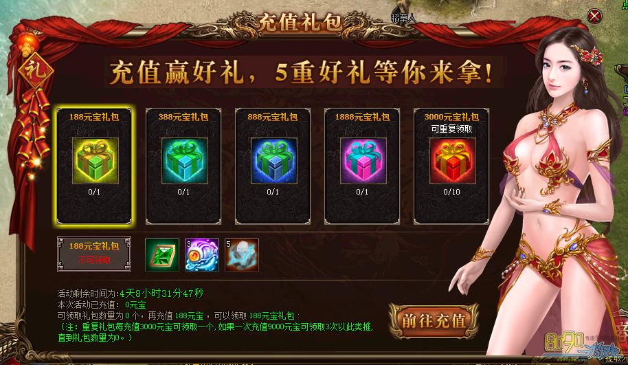 活动详情:活动期间充值达到指定元宝数,即可领取一份对应充值礼包,3000元宝礼包更可重复充值领取10次,每充值3000元宝可领取一个,直到礼包数为0为止。