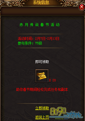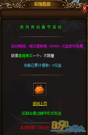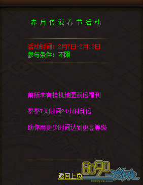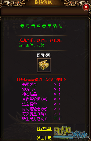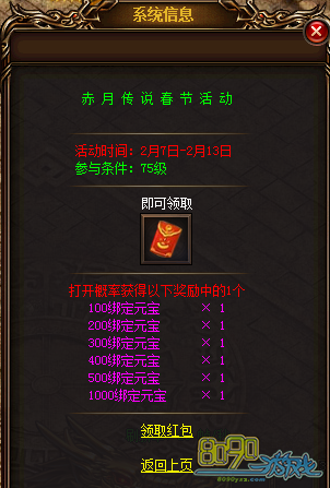 参与方式:玩家可打开右上角【喜迎新春】图标,或者在赤月皇城148,89【节日使者】处查看活动内容