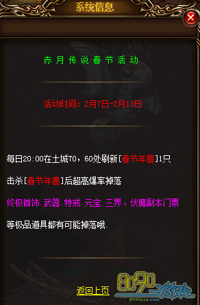 【活动内容】活动期间,每天20:00在土城会刷新春节年兽