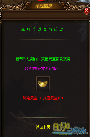 【活动内容】活动期间,充值元宝返还10%充值元宝的绑定元宝