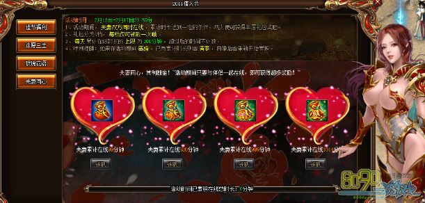 活动期间,夫妻双方同时在线,累计在线时长达到条件即可领取对应的在线礼包奖励,没档奖励每人只可领取一次,每天在线时长有360分钟上限,超过后当天不再累计。注意:活动期间玩家离婚后累计在线时间会清零,重新结婚后重新由零开始累计,领取过的礼包也不能在领取。