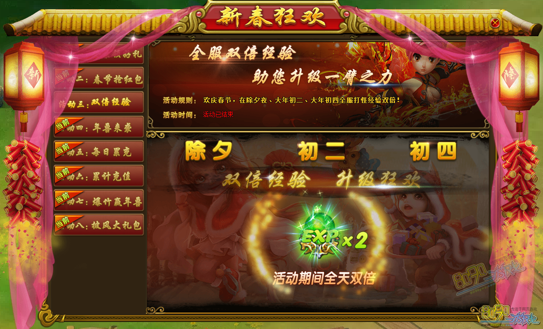 活动内容:活动期间除夕(2月7日)、初二(2月9日)、初四(2月11日)所有玩家都将获得双倍打怪经验,期间配合经验丹效果翻倍。