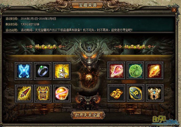 活动内容:活动期间,天龙宝藏将有几率获得寒魄冰龙(幻羽)、神力戒指、全新幻化坐骑—瑶光玉驼!更有首次亮相的传奇战神套装六件降临!机不可失,时不再来,赶快来寻宝吧!