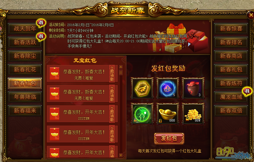 活动内容:战贺新春,红包来袭!活动期间,开启红包功能,战天壕们可发放红包的同事获得红包大礼包!GM每天20:00~21:00期间发送大量红包回馈玩家,手快有手慢无!