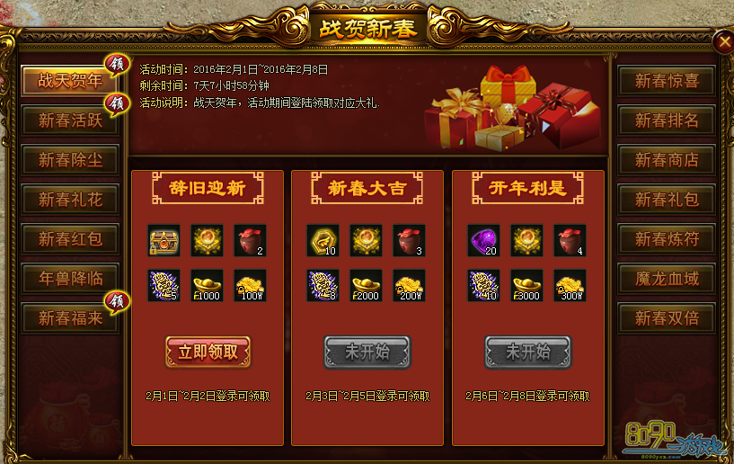 活动内容:活动期间,每天登陆即可领取奖励,不要忘记领取哦!