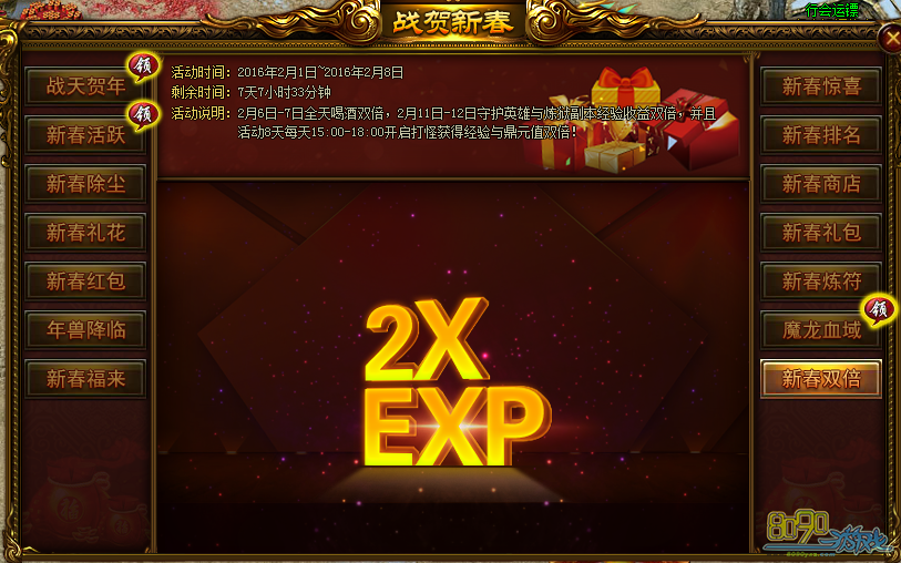 活动内容:2月6日~7日全天喝酒双倍,2月11日-12日守护英雄与炼狱副本经验收益双倍,并且活动8天内,每天15:00-18:00开启打怪获得经验与鼎元值双倍!