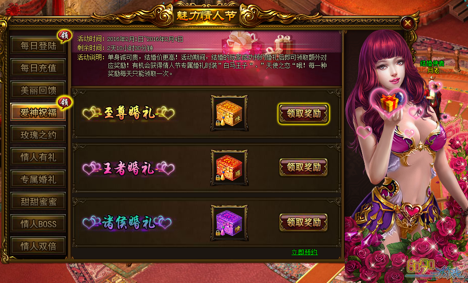活动内容:单身诚可贵,结婚价更高!活动期间,预约婚礼即可领取额外的奖励,更有激活获得情人节专属婚礼时装“白马王子(男)”、“天使之恋(女)”!每一种奖励每天只能领取1次!
