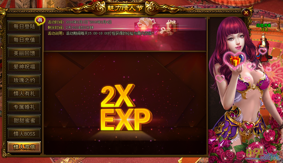 活动内容:活动期间击杀精英怪和BOSS掉落红玫瑰、粉玫瑰与紫玫瑰。献上一定数量的玫瑰可向爱神许愿,可获得经验、金币以及大量属性道具!