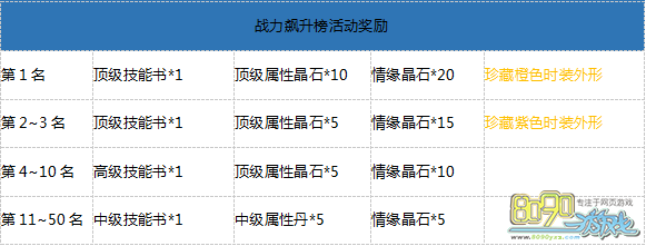 活动期间,每天提升战力最多的前50名玩家,都可以获得一份特殊的奖励!战力提升的越多,名次越靠前,奖励越丰厚!