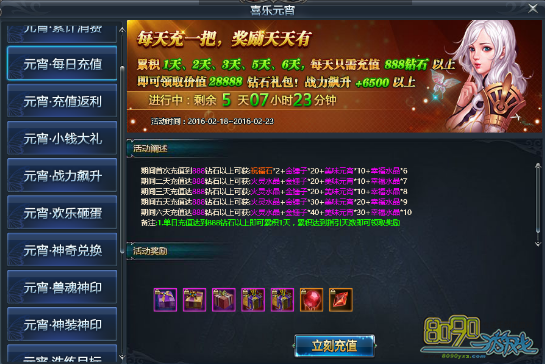 【活动内容】:活动期间,小充一把玩玩,奖励大把爽爆!累计1天、2天、3天、5天,6天,每天仅需充值888钻石以上,即可领取价值28888钻石大礼包!战力飙升6500+!
