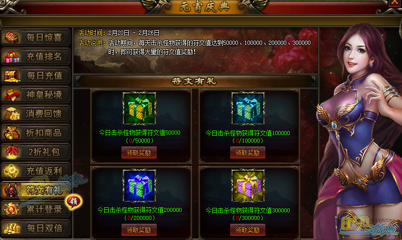 【活动说明】:活动期间,每天击杀怪物获得的符文值达到50000、100000、200000、300000时,即可获得大量的符文值奖励!