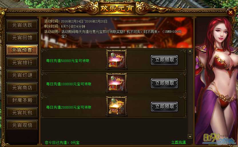 活动内容:活动期间,每日累计充值元宝达到1000、10000、50000、100000、200000时还可分别领取对应的丰厚充值奖励!