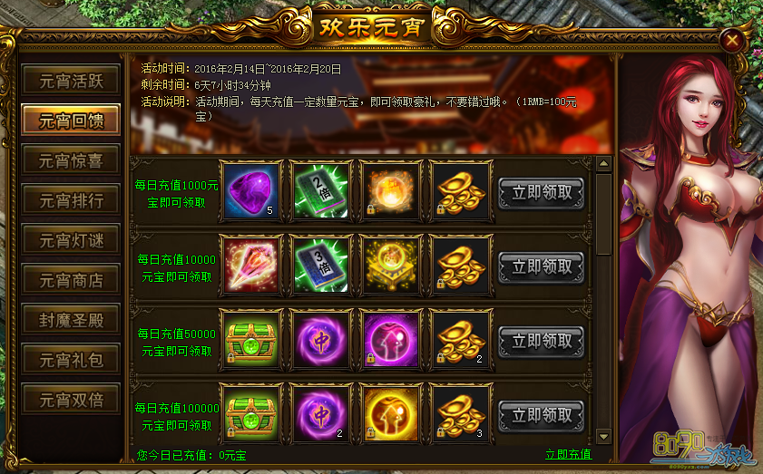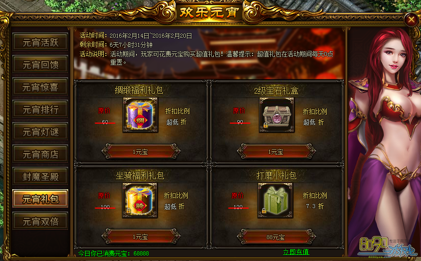 活动内容:活动期间,玩家可花费元宝购买超值礼包!每天0点重置!