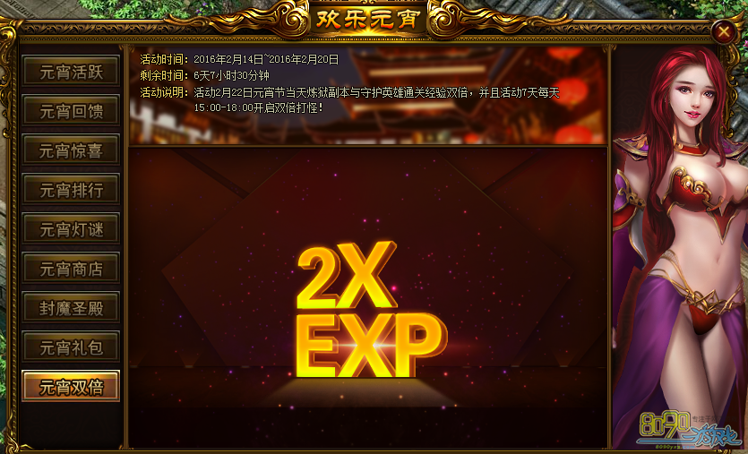 活动内容:元宵节当天(2月22日)炼狱副本与守护英雄通关经验双倍!活动期间每天15:00~18:00开启双倍打怪活动!