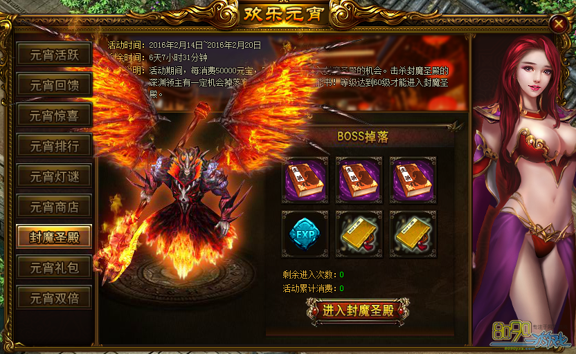 活动内容: 活动期间,每消费50000元宝可获得1次进入封魔圣殿的机会,击杀封魔圣殿的深渊领主有几率掉落职业高级技能书、坐骑技能书以及经验符文等。