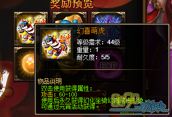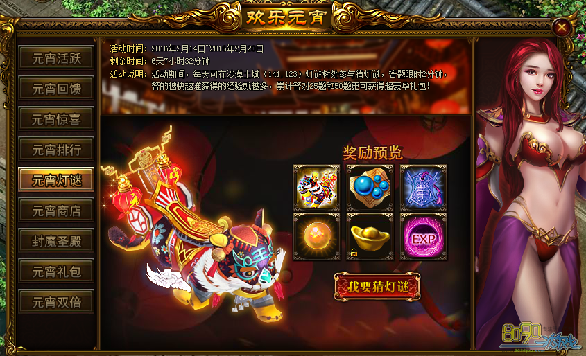 活动内容:活动期间,玩家可在沙漠土城(141,123)灯谜树处参与猜灯谜!答题限时2分钟,答题速度越快和数量越多,获得的经验越多,累计答对20道和50道可获得超豪华礼包。礼包使用后有几率获得元宵专属萌宠—欢喜萌虎。