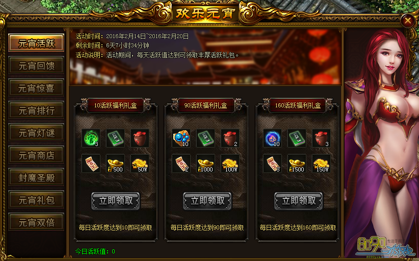 活动内容:活动期间,每日活跃值达到10、90、160时可分别领取丰厚奖励1份!
