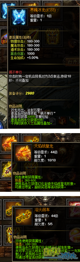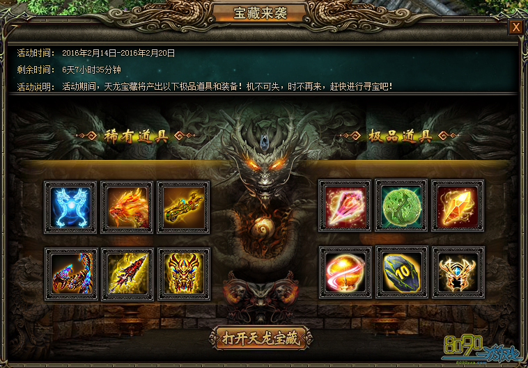活动内容: 活动期间,天龙宝藏寻宝将有几率获得寒魄冰龙(幻羽)、天焰战皇龙、浴火战车、琥珀战蝎、战天传奇套装等极品道具!赶快来寻宝吧!