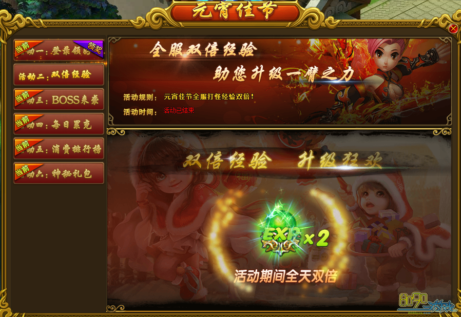 活动内容:活动期间所有玩家都将获得双倍打怪经验,期间配合经验丹效果再次翻倍。