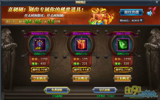 活动期间将开放神秘商店,各类进阶石,各类洗炼,神印进阶石等,都有可能出现超低价,各种超低折扣不容错过!同时,可以根据个人需要,刷新神秘商店内出售的物品,每次刷新,都有可能会出现不同的物品!