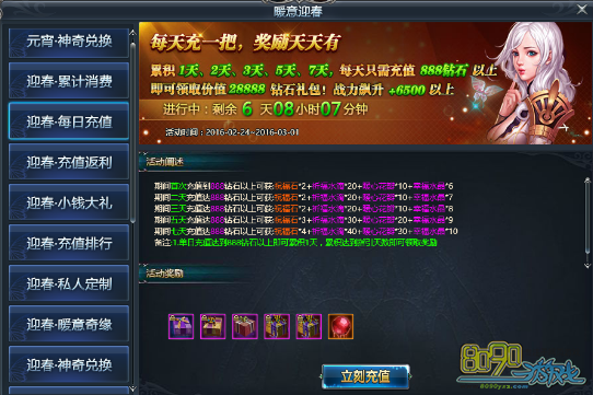 【活动内容】:活动期间,小充一把玩玩,奖励大把爽爆!累计1天、2天、3天、5天,7天,每天仅需充值888钻石以上,即可领取价值28888钻石大礼包!战力飙升6500+!