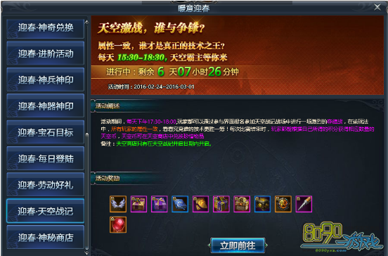 【活动内容】:活动期间每日17:30~18:00,玩家都可以通过活动界面报名参加天空战记战场进行激烈的夺旗战,在这个玩法中,所有玩家的属性一致,看看究竟谁的技术更胜一筹!每次比赛结束时,玩家都可根据自己所得积分获得相应数量的天空币,兑换天空商城中的珍贵道具!