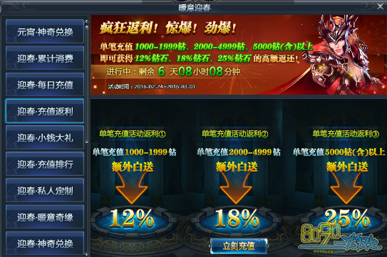 1.单笔充值1000~1999钻即可获赠12%钻石高额返利!