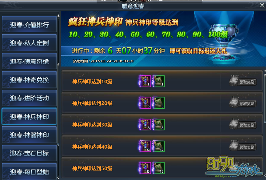 【活动内容】:喜迎神器神印开放,提升神器神印至指定等级,即可领取丰厚奖励!