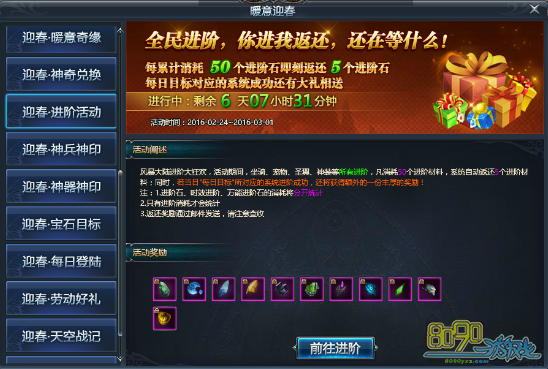 【活动内容】:风暴大陆进阶大狂欢,活动期间,坐骑、宠物、圣翼等所有进阶系统,凡消耗50个进阶材料,系统自动返还5个进阶材料;
