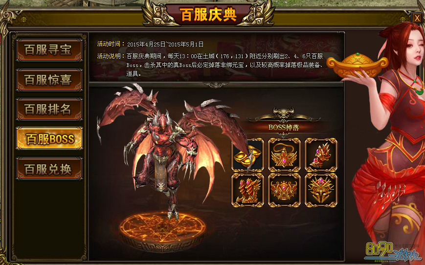 【活动内容】:百服活动期间,每天13:00在土城(176,131)附近分别刷出2、4、6只百服BOSS,其中有真假BOSS哦,击杀真BOSS后必定掉落非绑定的元宝,以及较高概率掉落极品装备和百服兑换活动道具!