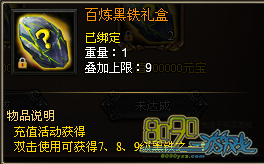 【活动内容】:百服活动期间,每天充值一定数量元宝,即可领取百炼黑铁礼盒回馈奖励!每天累计充值达到50000元宝,可以领取1个百炼黑铁礼盒,每天累计充值达到100000元宝,可以再领取2个百炼黑铁礼盒,开启百炼黑铁礼盒可随机获得7~9级黑铁之一!
