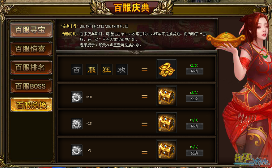 【活动内容】:百服活动期间,可通过击杀BOSS收集百服BOSS精华来兑换奖励,