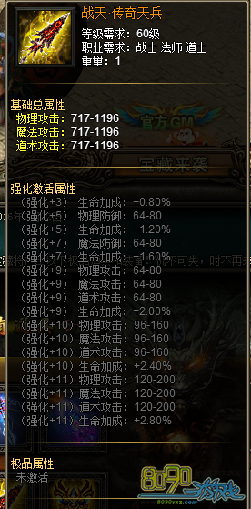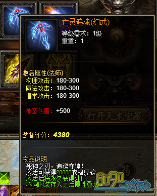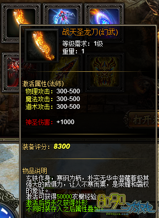 活动内容:活动期间,天龙宝藏将有几率获得战天圣龙刀(幻武)、亡灵追魂(幻武)、血魔帝袍(幻装)以及战天传奇套装全部部件等极品珍稀道具!