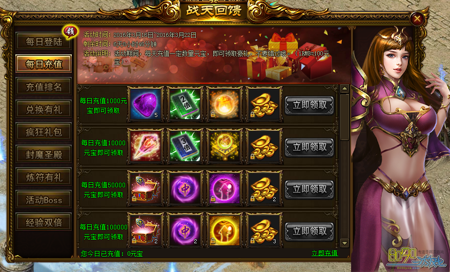 活动内容:活动期间,每天充值一定数量元宝,即可领取豪礼!不要错过哦!