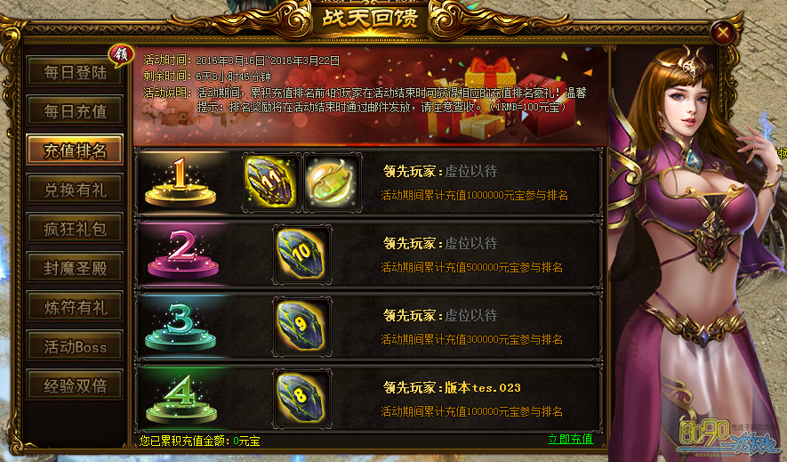 活动内容:活动期间,累计充值排名前4的玩家在活动结束时可获得相应的充值排名豪礼!奖励通过邮件发放。